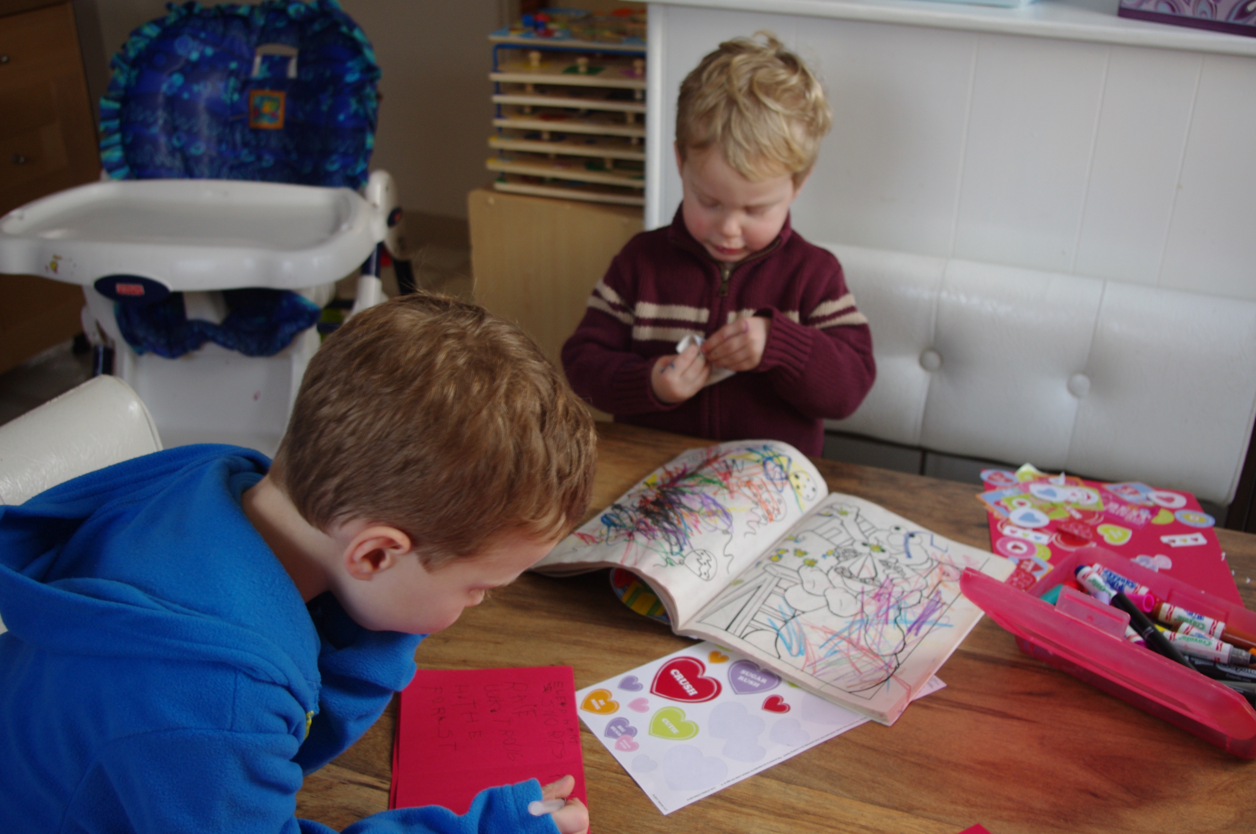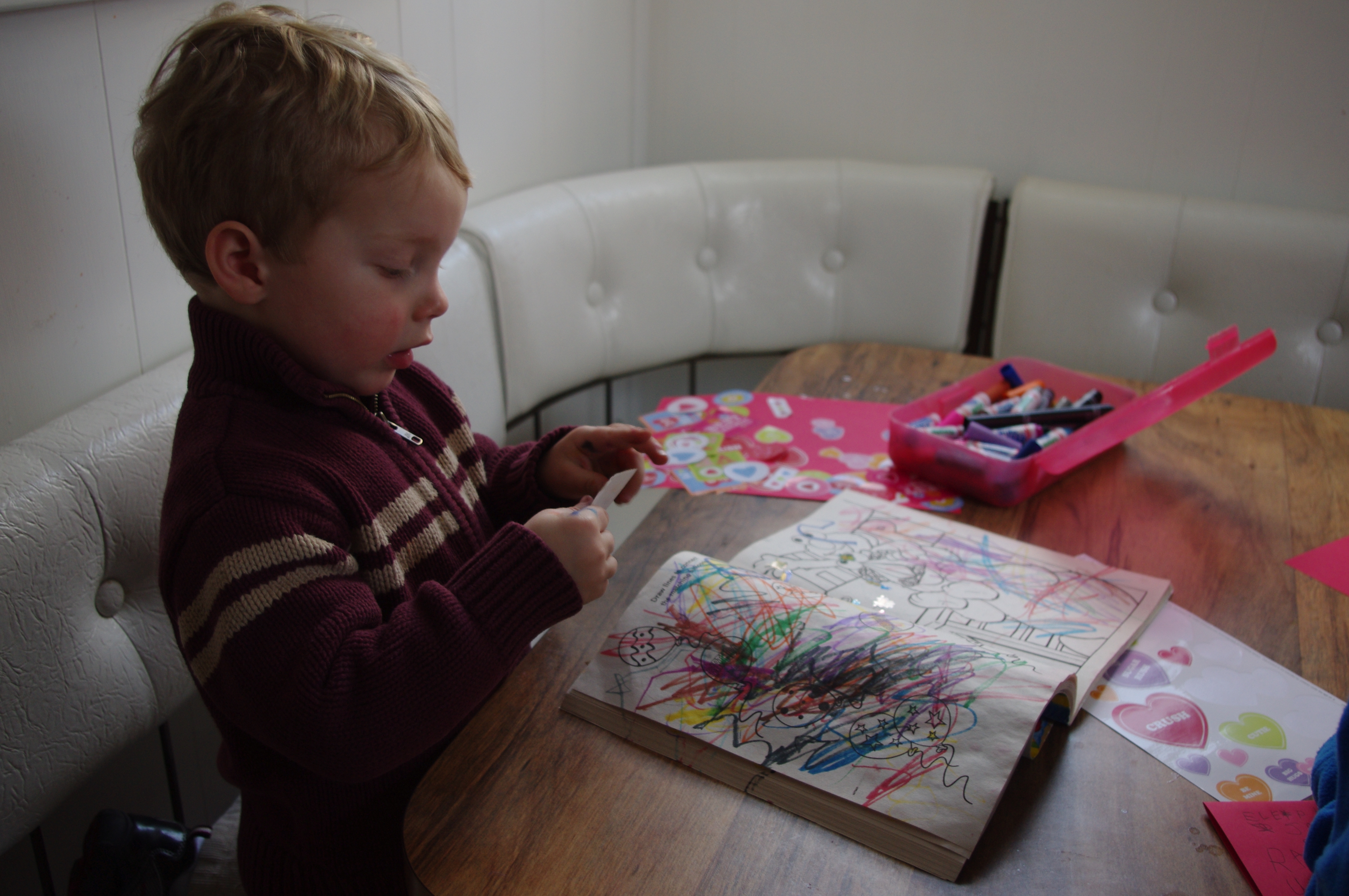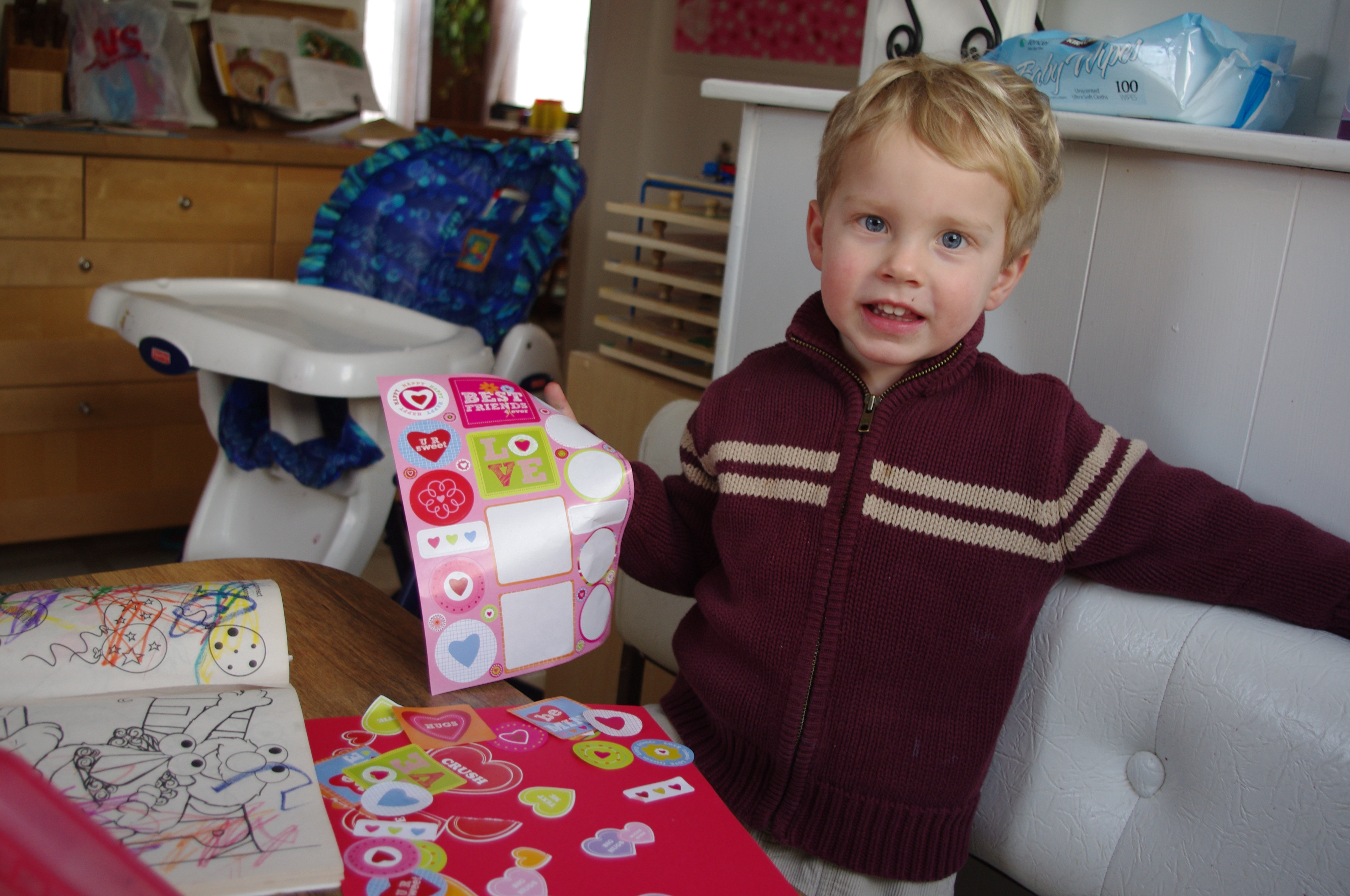 Stickers. Thane loooooooves stickers. He will spend 30 minutes moving tiny little stickers from one piece of paper to another. Stickers. Dinosaur stickers. Mickey stickers. Smiley stickers. He doesn’t care, he just wants stickers stickers stickers stickers stickers.