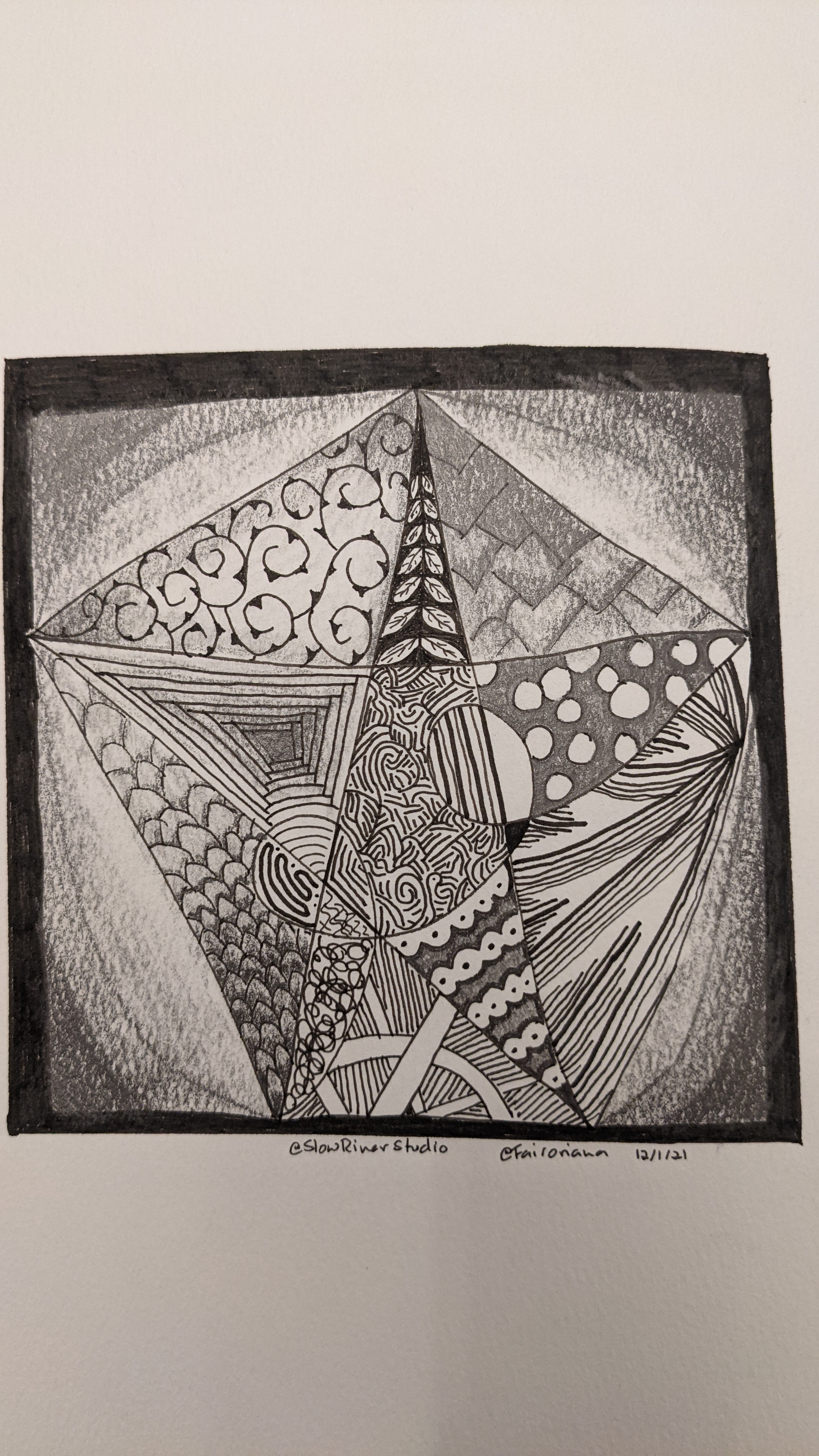 This zentangle is inspired by reading Gawain and the Green Knight. He has a pentangle on his shield and the author goes on for quite some time about the theological significance of it.