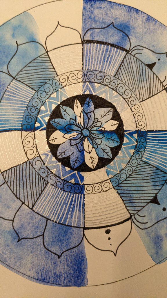 This unfinished mandala really reminds me that I like watercolors a lot. That was my favorite part. The finicky work of repetitive designs seems like a wonderful doodle, but now how I’d usually want to spend “prime” creative time.