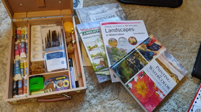 Little can strike terror into the heart of a bad drawer like wheels. Many of our bold number quailed when our first assignment was a covered wagon with an excess of spokes and shadows. There’s nothing like watching an expert wave a brush across a page and a brilliant, colorful, characterful painting just appears, and then tackling it yourself. This was a warmup effort – my shadows are particularly disappointing. But they can’t all be winners.