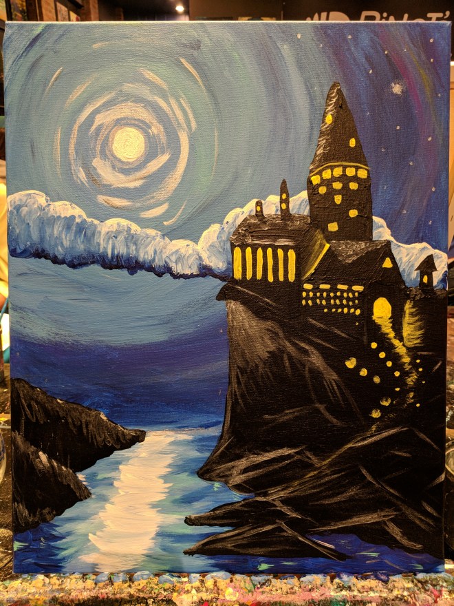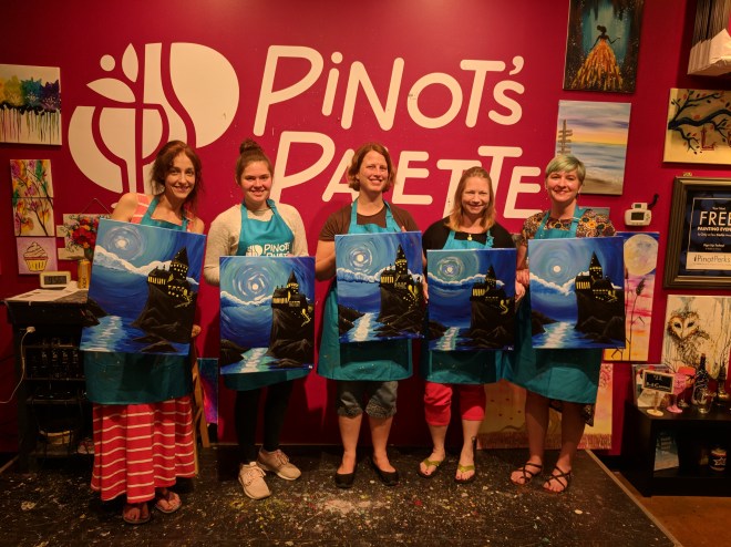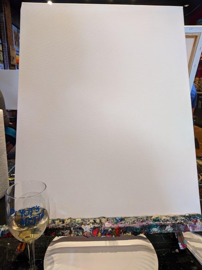On Saturday I learned that some friends were going to a paint and wine night and I managed to cadge an invite. Now, I was a band geek of the first water. When electives were coming around, there was absolutely no doubt which one I was going to sign up for. So I never did art in high school. Or college. Or, well, ever. In fact, my nascent art career was cut short with one of the more bitter regrets of my young life. I begged my parents for art lessons when I was about 9. I remember going to a stationer’s store (I’M SO OLD) and buying the pencils, the sharpener, the paper and the special eraser. I was out of my mind excited. The teenager who showed up was an excellent artist at the high school level. But I was so wound up and energetic that I was hard to teach. She got frustrated with me in that first lesson and never came back. I ended up having been taught one method of drawing fir trees, but with a far more useful life lesson: If you want to learn, you had better make teaching you be a pleasure to your teacher.
