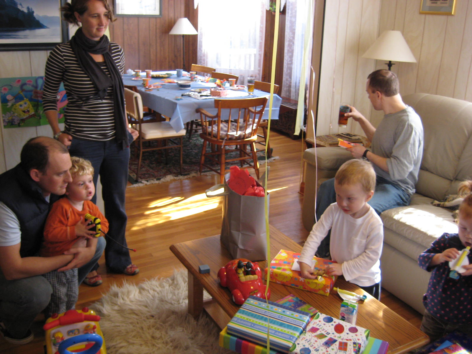 Grey had Jefferson and N. (a girl from church), and their respective parents. The kids played together pretty well — although the difference between boy-personalities and girl-personalities was marked. Grey got a balloon that sings an incredibly obnoxious version of “Happy Birthday” when you hit it. (Who’s brilliant idea was that? Oh yeah… mine.) So Grey and Jefferson were happily hitting each other over the head with balloons and giggling furiously. N. was terrified. The kids played together for a bit while we grownups sat on the couch and gossiped. Then there was happy-birthday-singing, followed by candle-blowing-out and cake-eating. (Two years olds can be surprisingly reticent to eat cake.) This was followed by present-opening. I was impressed that the other two kids didn’t try to open the presents themselves. This is a hard part of other people’s birthdays. Then the party was over and the diapers were full and the kids were cranky and it was time to go home. Perfect. The presents all seemed to be a big hit and Grey got down to the serious work of playing with them.