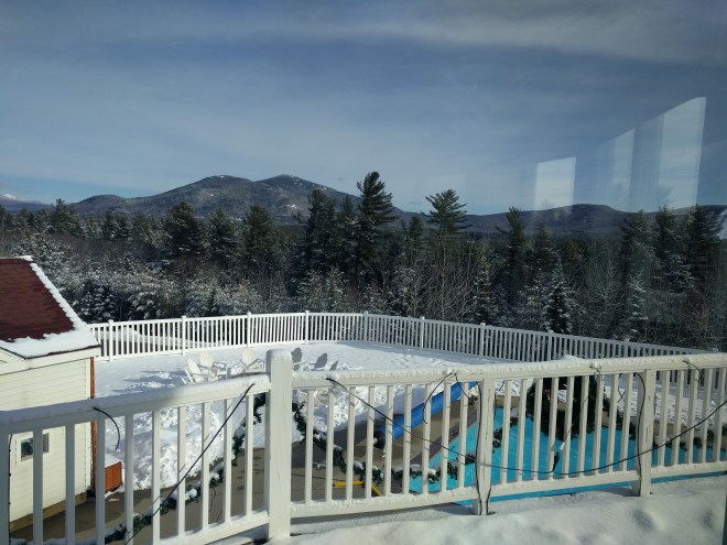 My daydreams got off to a great start this morning! We had the famous brunch. I drove the boys to Attitash and pushed them out of the car. “Bye guys!” Then I hightailed it back to the hotel to brew coffee, stare out the window, and write the next major scene in my long-neglected novel. Heck, it’s the penultimate scene. I’m almost there. After about 2000 words, I decided to exercise both mind and body and put on my work out gear. This is the first time in the history of me I’ve actually followed through one of my resolutions to run while on vacation. I’d really like to do a serious hike this summer, so I have motivation to get fit.