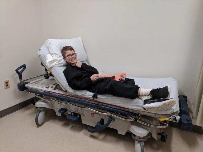 The hospital was close and *very* well set up to deal with out-of-staters with skiing injuries. In a hilarious turn of events, while waiting with my son I got a LinkedIn message from a former coworker who had worked with me years ago. His daughter had a rather more serious leg injury in the room across the hall. It was a weird place to catch up, but we did so anyway!