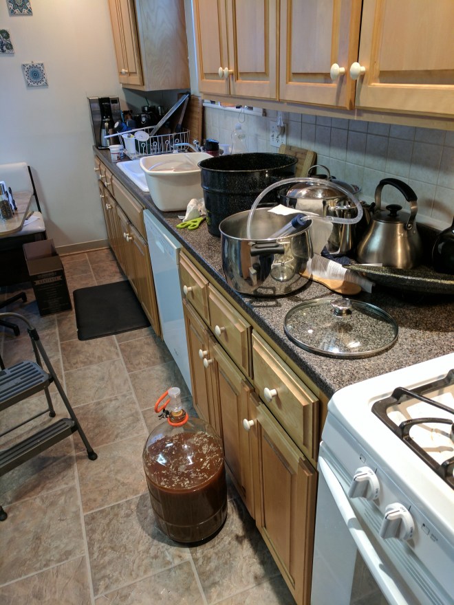 Over Christmas, I brewed the first kit. It was a teeny one gallon kit, perfect for a trial run. I read through the book. I watched a Youtube how to video. I cleaned the kitchen and read through all the various steps multiple times, lining up my tools like a surgeon.