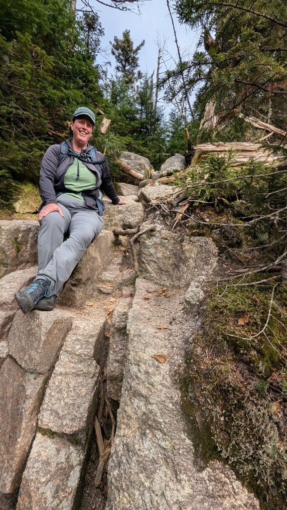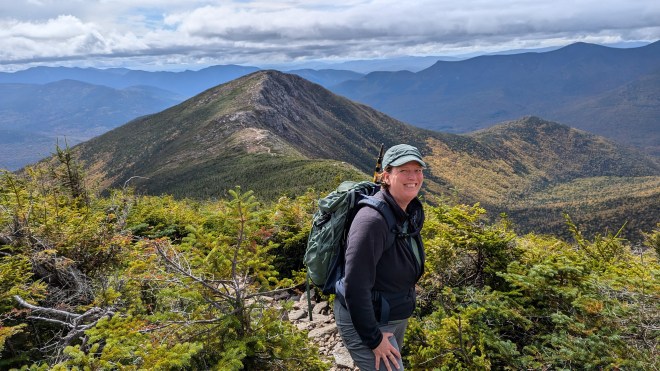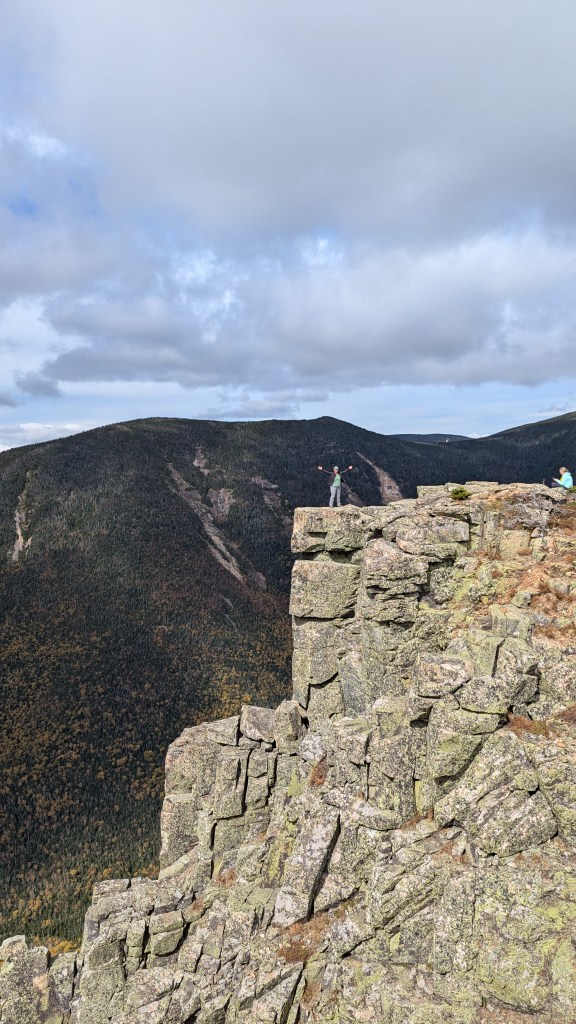 I wrote back in July about my history and love of hiking – and my struggles with a bum knee that threatened to end my career. I thought a lot about how this has all evolved. On my 46th birthday, I finished my 45th, 46th, 47th and 48th peaks as part of the NH 48. This hike was left to last because there’s NO GOOD WAY to get to the Bonds in less than 20 miles of hiking. I talked a few of my friends into joining me (one who has done it before and the other of whom didn’t ask enough questions ahead of time). We came up the day before, and did a fun little 5 mile hike up Mt. Hale and over to the AMC Hut at Zealand. (Of Mt. Hale my friend was like “I hope the summit view is worth the hike!”. Friends, there is no summit view at all on Hale.) We laid in the middle of the river to watch night overtake the sky and the Milky Way emerge, and were in bed asleep by 9 pm. Up with the sun the next morning for an AMC hut breakfast, and out the door by 8 am already in a hurry. Up, up and up on the rocky trails, with the first view (and cell signal) at ZeaCliff.