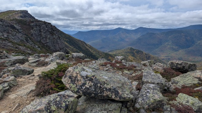 Yesterday I had the biggest hike of my life. The many different methods of tracking disagree wildly on all these, but it was about 20 miles, definitely had 7 distinct summits, required about 6000 feet of elevation (both down and up), took 13 hours, clocked 60k steps, and involved approximately a bajillion rocks and two good friends. When we stumbled into the parking lot a few hours after dark, Anthony said, “Congrats. You have OFFICIALLY completed the 48 New Hampshire 4000 foot mountains.”