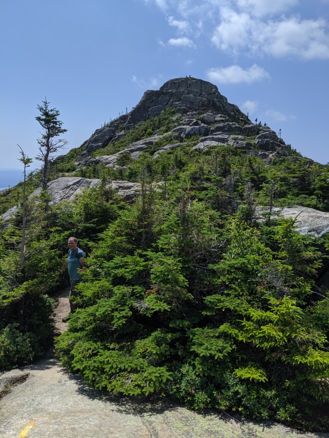 Champney Brook has a quick loop that for the measly cost of .1 of a mile gives you a long and lingering view of beautiful waterfalls across granite. The morning was still cool when their steps brought them to the falls, already the province of old hikers and young enthusiasts alike. With hours of hiking in front of them, they still lingered in front of the splashing spray of the clear mountain river, pure and golden in morning light. Heedless of risk to shoe and sock, they hopped across stones like a pair of young kids instead of the sedate software Stonehamites you may have met. Pushing across shimmering waters, they found a long dark wall of basalt with a vernal fall silhouetted against the impossibly blue sky and green leaves. They lingered in the spray of the waters, marveling at the work done by ephemeral water against impossibly soft stone. But the summit still awaited, and the heat would only mount throughout the day. They tore themselves away with deep regret that they and their to-be weary feet would not pass this way again. At least not this trip. If there were secret heart-felt vows to come back again with hiking-reluctant loved ones, they were only somewhat spoken.