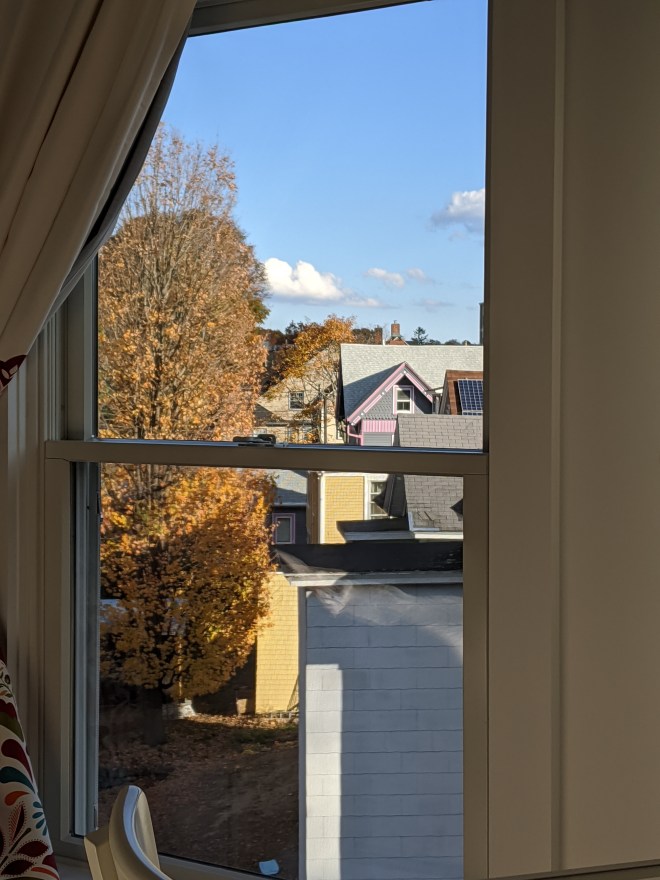 And that brings me back to the sweet hour of prayer. (OK ok, honestly, sweet fifteen minutes.) I’ve started creating my own sanctuary and litany. My quietest time is morning, after my boys are all already gone to school and work. (I am not a morning person.) I sit on the white chair by the window and look out at the morning and the sky and try the rusty skill of prayer. I’m really not very good at it for someone who’s working on their fifth decade of Being Christian.
