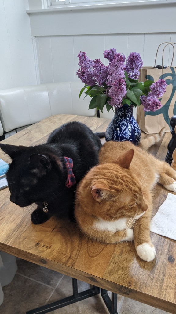 The second cat was a tortie – mostly black with orange highlights except for the very tip of her five-month-old tail which is vibrant orange. Violet, as she was called, was lithe and powerful like a tigress, and ardent in her affections to the hands which stroked chin and shoulders. She’d been returned along with another cat after a week, with no reason given, so we don’t even know where she hailed from. She is DEFINITELY trouble, but that is the nature of a cat. She’s also sweet and affectionate and snuggly and has cat ADHD (in my very professional diagnosis).