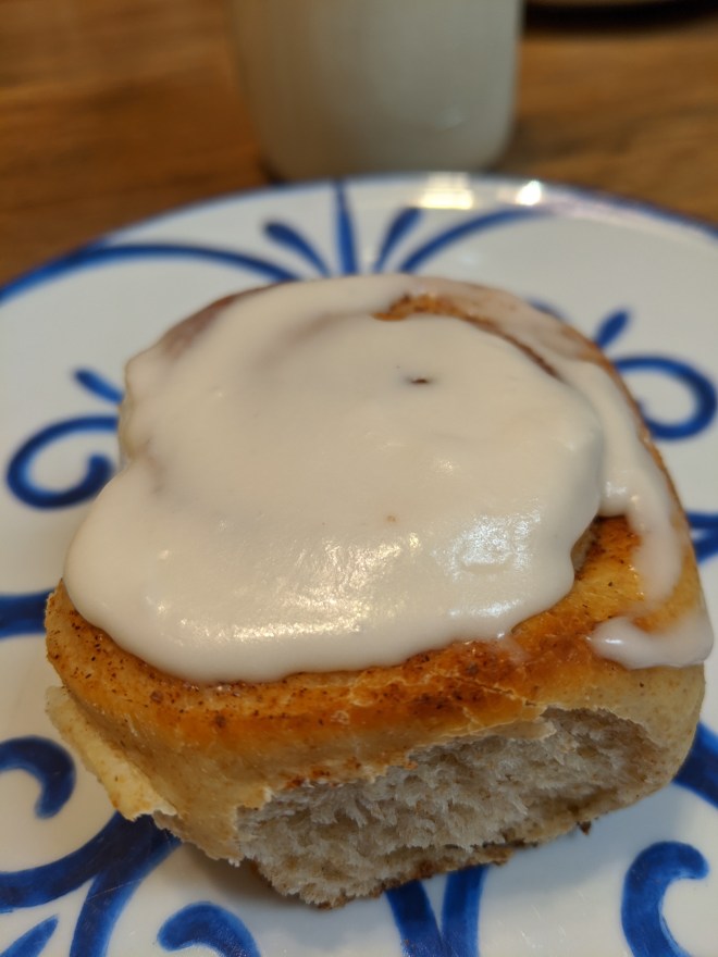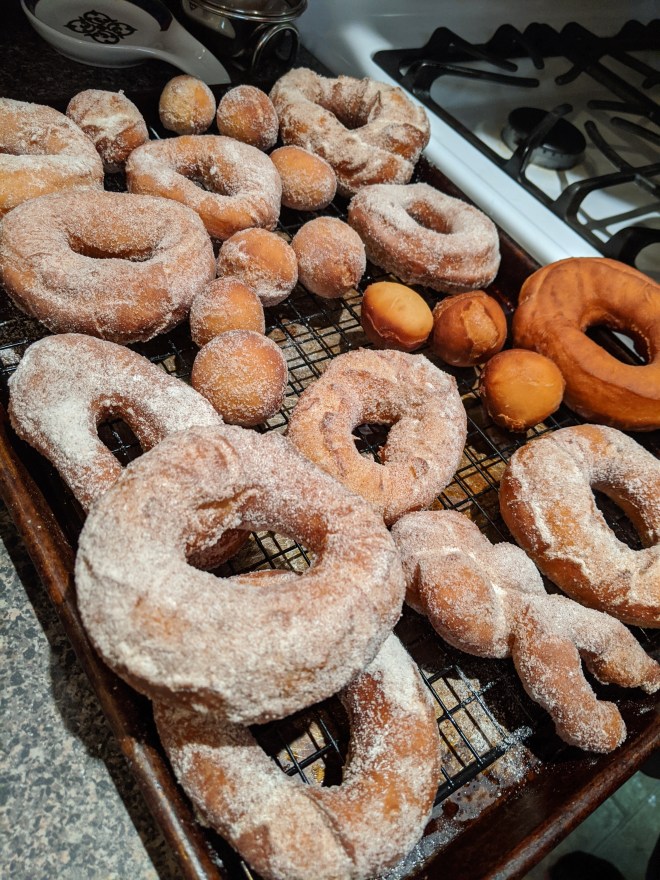 I found myself thinking of this as Adam and I pursue some of our 19th century interests in support of the life we are now living. As you all likely know by now, I’ve been baking like a fiend, as has Adam. We (ok, Adam) started a wild-caught sourdough, and we’ve made doughnuts, loaves and loaves of bread (Adam), garlic knots (twice), dinner rolls, lemon poppyseed pound cake, hot cross buns, sourdough cinnamon rolls (twice), vegan chocolate banana bread muffins, and truly awful sponge cake. I’ve learned things in the process, like how not to make sponge cake, what autolyzing is (and when to use it) and the differences and uses of active dry and instant yeast. I still have much to learn, especially about how not to be spherical if I eat all this stuff.