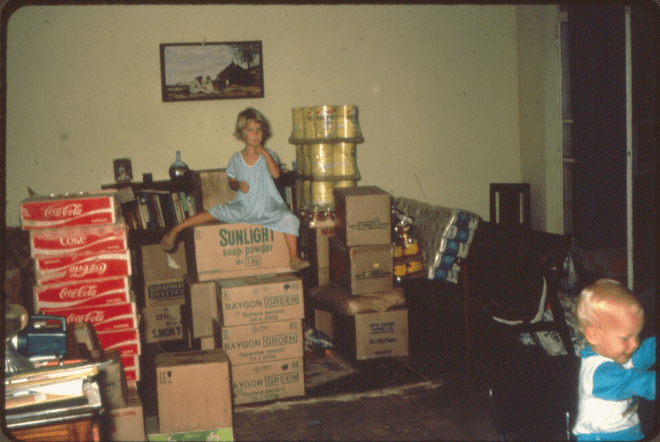 This is my parent’s supply drop when they were in Africa. According to my sister this represents 6 months of food. The massive amount of soda here cracks me up – my parents made many sacrifices, but not the sodapop! Of course, this was supplemented with bananas from the garden, eggs, chicken and local foods – which were neither plentiful nor varied. (For the record, I’m the waif in the lower right.) The picture on the wall still hangs in my parents house.