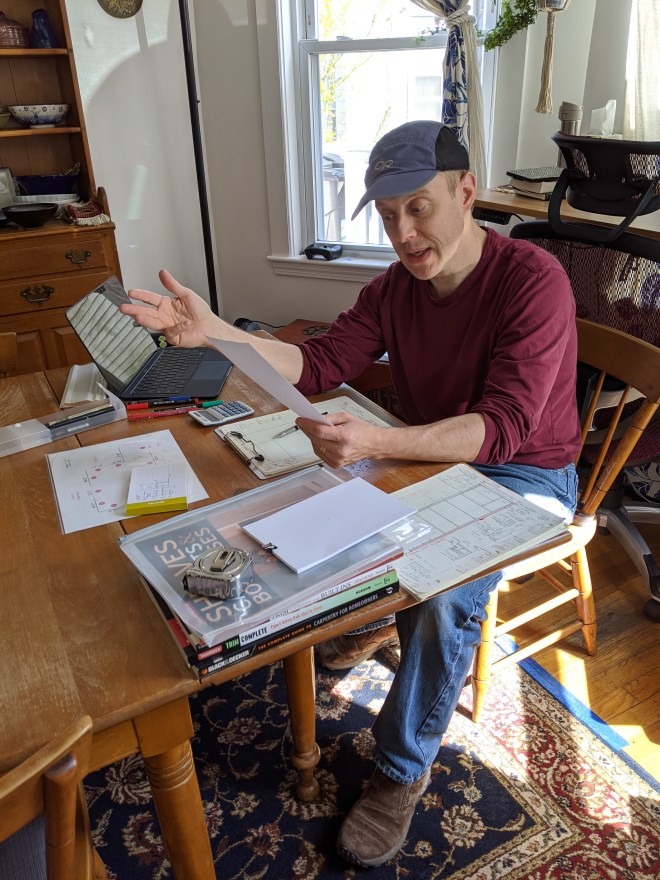 One of the many things I love about my husband is the seriousness with which he tackles learning new things. Right now, next to his desk, you can find a sheet which shows his experiments making boules (round bread loaves) and seeing which combination of techniques and ingredients leads to what outcomes in terms of crumb, density, flavor etc. He also has planned out the attack for the book cases (which are also intended to hold the cat litter boxes in an inobtrusive way) carefully; with lists, measurements, drawings and calculations. It’s really a joy to watch him tackle it, and dig in with all the seriousness and skill he brings to everything.