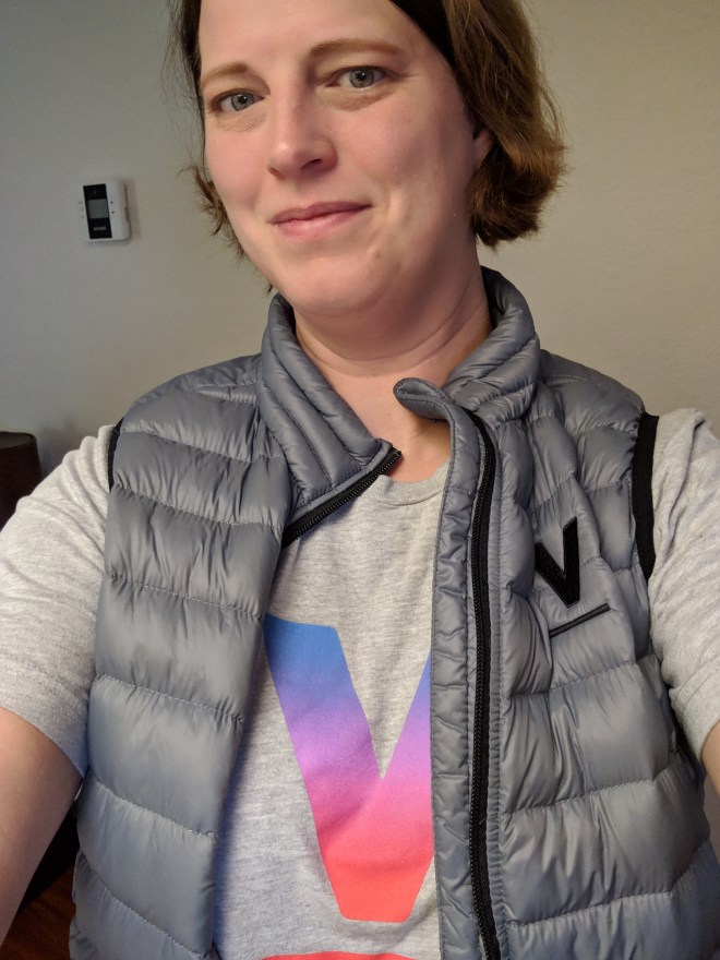 My second day of the offsite, a second company tshirt. I have probably 3 more than I could wear today. I particularly like this tshirt because it’s soft and cozy. I couldn’t get a picture, but there’s some text on the arm. I also figured I’d show you my new vest, which has the same logo (in black). I have it on good authority that these vests are the cutting edge of high tech swag.