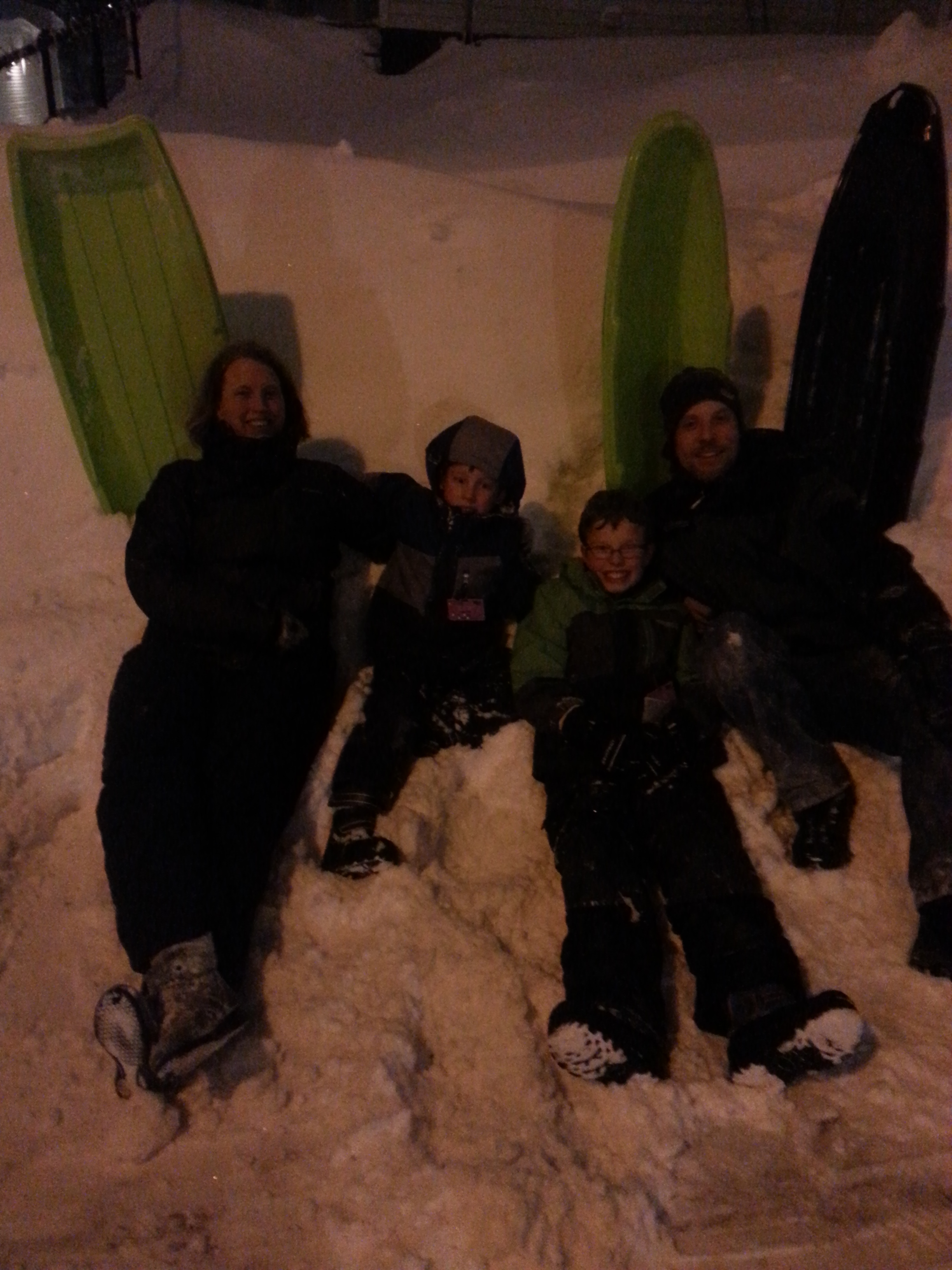 9. Twelve was the number of sledding runs I took tonight, after leaving my neighbor’s lovely blizzard potluck. I’d missed out on getting a single run in last week, when the snowplows were thick as mayflies. But tonight our street was deserted with about two inches of fine powder. My boys, seeing me out there, hopped into their snow gear and joined me rocketing down our street.