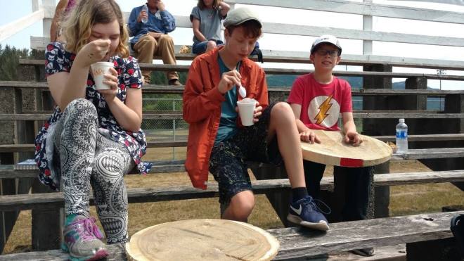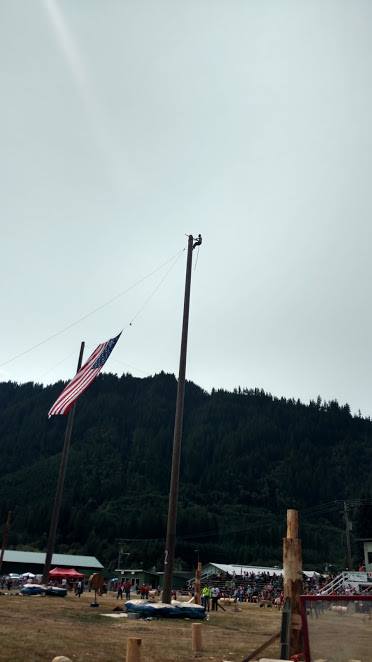 Camp Gramp has officially started. It had an unusual start. People have been here for 4 days, but Brenda and Adam left for Ashland today, so it is just the two generations. We decided to go to the Morton Loggers’ Jubilee. We saw the toppers climb 80 ft in the air with the axe hanging from their belt. Then they topped the log. We saw the Hot shot chain saws, and hopefully prevented hearing damage. The two person buck saws were fast and we watched people use their axes standing on a buckboard. Parents, you will be pleased to know that each family now has a souvenir. (Editor’s Note: I’m hoping to get Adam to turn our souvenir into a table.) Let me know how you want me to ship it to you! There was a competitor from Golden Valley, MN, and one from Australia!