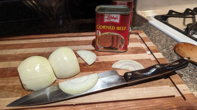 In a large dutch oven, cook the bacon. Add the onions. Chop up the corned beef (not slicing any fingers on the weird pot things that exist in no other food type than potted meats). Add the water, and then pull the skins off the potatoes (burning fingers in the process optional) and chop into large cubes. Add to pot with garlic salt, and then cook for a long time. Maybe a week.