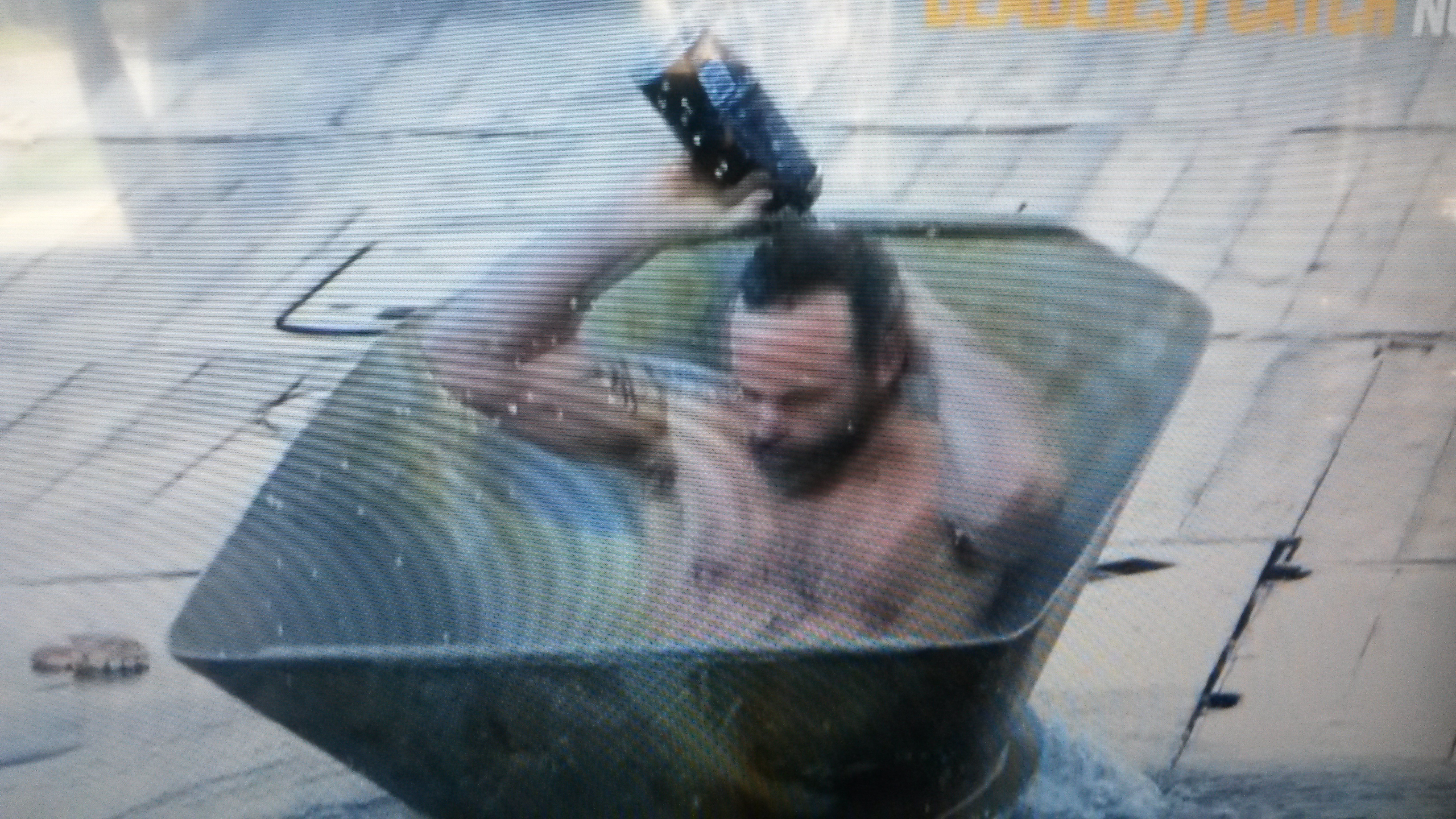 He comes back onto the deck, stripped down. He takes off his shirt as he walks to the middle, leaving boxers and his wellingtons. (Still can’t figure out why he left his boots on!) Then, he jumps in the crab tank. In January. On the Bering Sea. In sub-freezing temperatures. In front of all his crewmates. He stayed in long enough to get totally wet, making a huge show of scrubbing his armpits with a bar of soap. As he comes out, his “friends” aim the saltwater hose at him to help him rinse off.