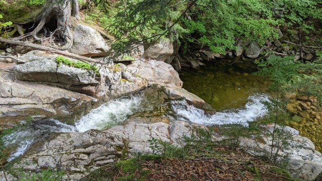 The Appalachian Trail between Garfield and Galehead is one of the gnarliest sections of trail on the whole two thousand mile expanse. There’s this one amazing section where you come to a creek, and you can’t figure out where the trail goes, until you catch the faint white blaze halfway down the waterfall that the creek becomes. You then descend down the waterfall for the next exciting section. I showed the path to a thru hiker with a trail name of Stumbles. He swore in disbelief that this was the plan. This is when you’re happy you paid attention in the Wilderness First Aid class, but I didn’t end up needing any of it.