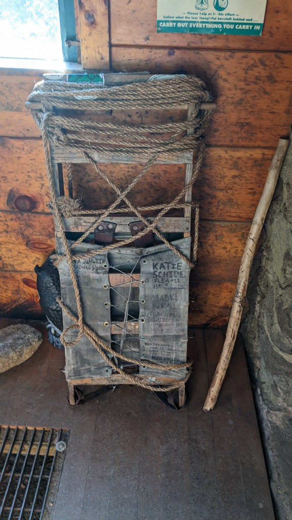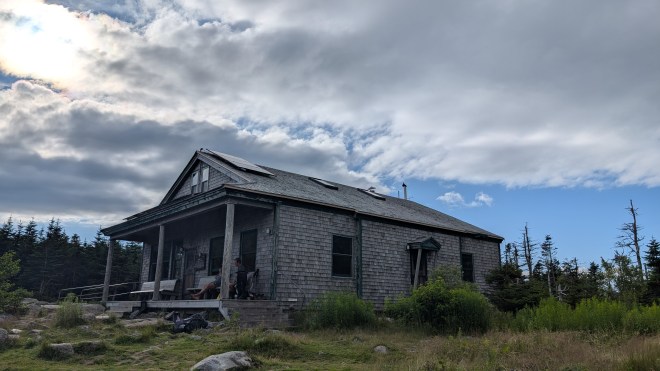 I made it down, across and back up again to Galehead hut, where I dropped pack and went up the extra half mile to claim rights to the very uninspiring summit. I love staying at the huts. You get to meet all kinds of interesting people. The Croo serve you a five course meal. There’s usually some sort of talk (last time I went it was an AMAZING geology talk that kept me rapt – this time it was a less academic discourse on Leave No Trace). The lights go off at 9 pm (so the Croo can go raiding the next hut for their stolen knight’s helmet), and you sleep in a bunk in a bunk room with as many as 12 co-ed bunks. It’s good bedtime comes early because they wake you at 6:30 for a three course breakfast so you can hit the trail early and they can start the next dinner. All the food and gear is brought up by the Croo on their backs using backpacks – which not only have not changed design in 100 years I swear some of them are that old.