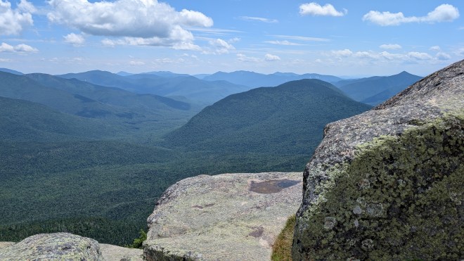 Mt. Garfield is a good haul up, and the heat had improved but not gone away. Still, I got up in good speed and lingered long on the sun-warmed rocks of the summit, looking out over the bowl of the Pemi wilderness, naming the mountain-friends ringing it. Owls Head – in the middle – is one of the most challenging mountains to reach since it’s so far from any trailhead. Franconia Ridge to the right shreds the clouds and egos of challengers, and I had been tempted to try to get over that way. But I definitely wouldn’t make a 6 pm dinner if I went right before I went down. There are some truly crazy people who do the “Pemi Loop” – or the entire bowl made of mountains you see here. I met at least two people who were doing the whole thing in one day. No matter what you undertake, you’ll find folks doing it ten times harder than you dare dream. And that ignores all the “thru hikers” doing all 2200 miles of the trail from Georgia to Maine – I met a bunch on this hike.
