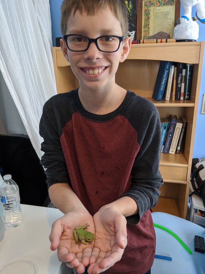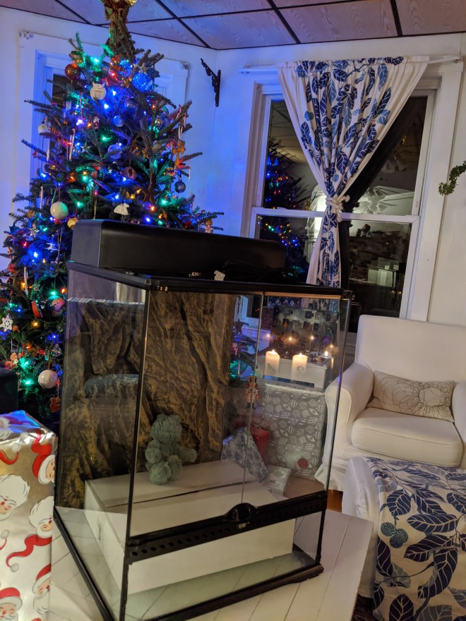 When last we left our heroes, they were two weeks before Christmas and their son had written a massively persuasive essay to the effect of he should get a frog. Much research was done. A terrarium was purchased and ready for Christmas morning. The amphibian excitement was running hot in the household. And lo! On Christmas morning there was the empty terrarium!