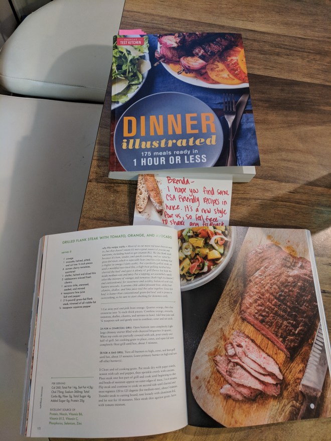 Another friend actually found the right cookbook for me. Two of them actually. And she sent them to me, which was incredibly kind of her. My own explorations were not nearly so successful. They’re both from America’s Test Kitchen (as is about 70% of my in-rotation cookbook collection). And they look AMAZING. Nutritious Delicious seems very much a response to “oh crap, my farmshare sent me kale again”. I particularly appreciate the nutrition information, but sadly it doesn’t tell me recipe prep time. I’ve definitely missed a “simmer for two hours” instruction before in recipes, so I really like the prep time estimates, even though I always assume they’ll take a little longer.