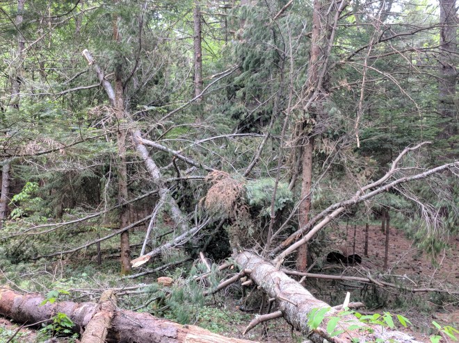 Our middle night in, with freshening winds rising up the valley along the Mad River, Adam and I were just getting ready for bed when we heard this iconic creaking, breaking and crashing sounds. Very clearly a tree had just fallen, very nearby. We listened for screaming – none. We went to where we heard it and were assured everyone was fine. One person said, “It wasn’t as bad as it sounded.” When I went back in the light of day, I had to beg to differ. I didn’t take pictures of their camp site, but this was only a few feet from tents, tarps and cars where a whole family was staying.