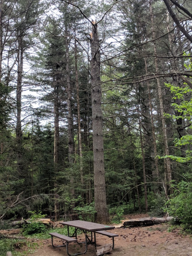 This was especially alarming to me since there was an already splintered pine tree very nearly overhanging our tent. This widowmaker was very stably caught in the Y of a very lithe and healthy looking birch tree – I couldn’t see how it could come free. But it creaked alarmingly in the winds. I would claim I couldn’t sleep soundly with it up there, but that would be an out and out lie. I think I might have been the most comfortable I’ve ever been in my life lying on that air mattress on Sunday morning.
